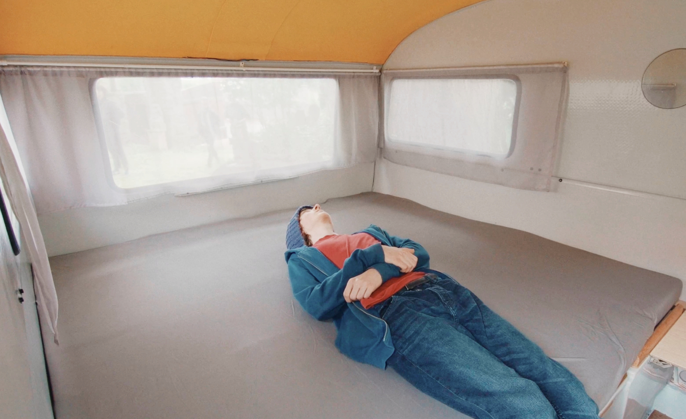 Der Wohnanhänger ist zu einem mobilen Hörsaal umgebaut. In seinem Inneren beher-bergt er ein großflächiges Audio-Liegekissen und mehrere Klangquellen an seinen allseitigen Flächen.